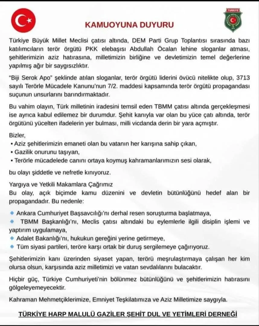 Türkiye Büyük Millet Meclisi çatısı altında, DEM Parti Grup Toplantısı sırasında bazı katılımcıların terör örgütü PKK elebaşı Abdullah Öcalan lehine sloganlar atması, şehitlerimizin aziz hatırasına, milletimizin birliğine ve devletimizin temel değerlerine yapılmış ağır bir saygısızlıktır.